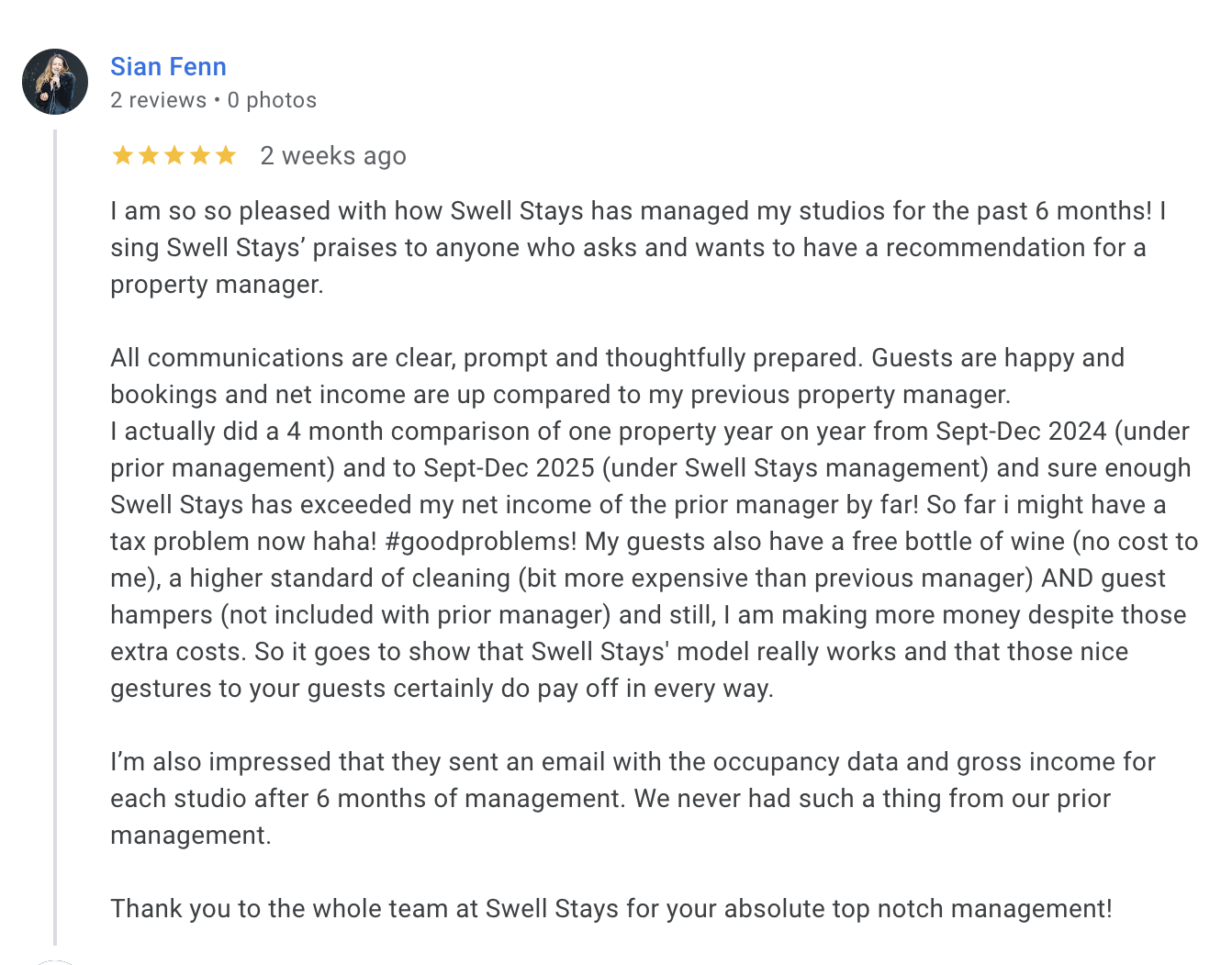 All guest payments are processed by Swell Stays. Owners are paid monthly.